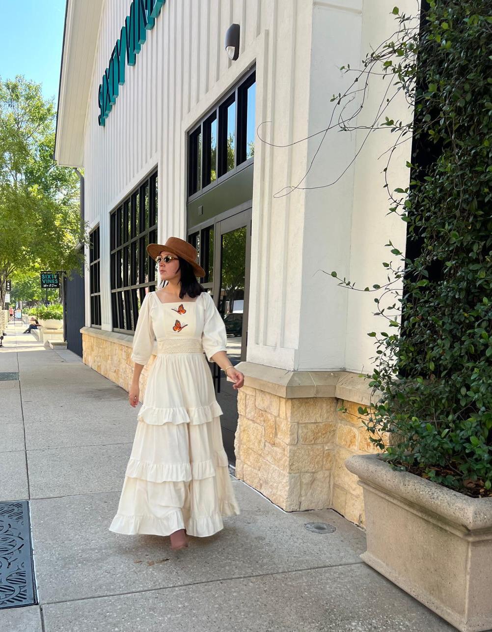 Look chic, sophisticated, and effortlessly elegant with this one-of-a-kind piece. Crafted from fine manta fabric and delicately hand-embroidered by skilled Mexican artisans, this dress is a true celebration of tradition and style. The asymmetric ruffles add a modern twist, making it a unique design that stands out on any occasion.
